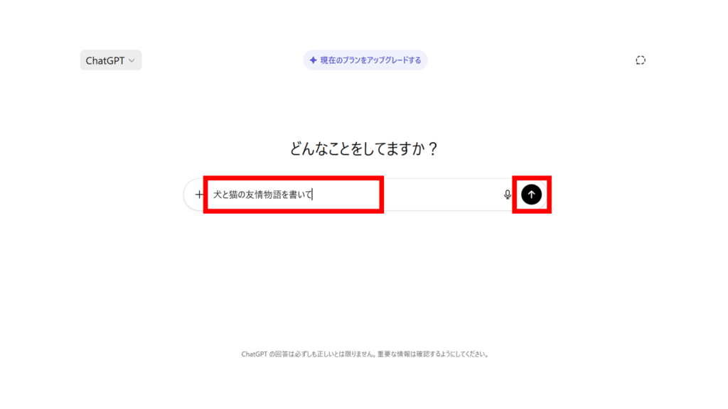 質問や指示を入力し、送信ボタン(↑)をクリックすると回答を始めます。