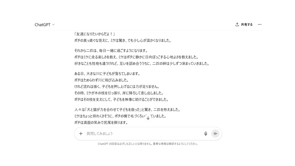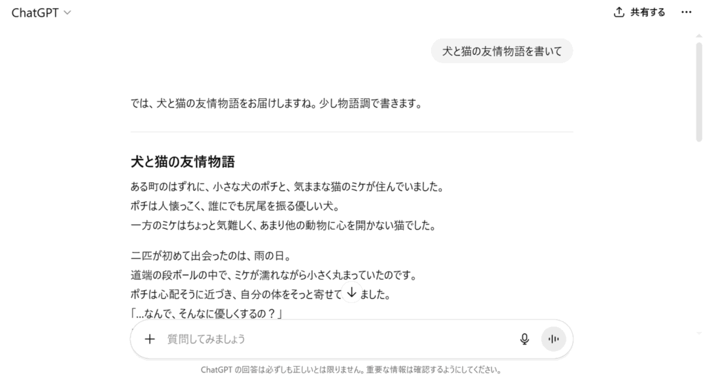 まずはテキスト生成。「犬と猫の友情物語を書いて」と指示をしてみます。