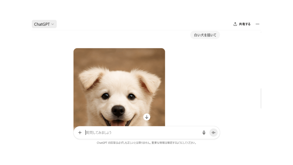 続いてイラスト生成。「白い犬を描いて」と指示をしてみます。